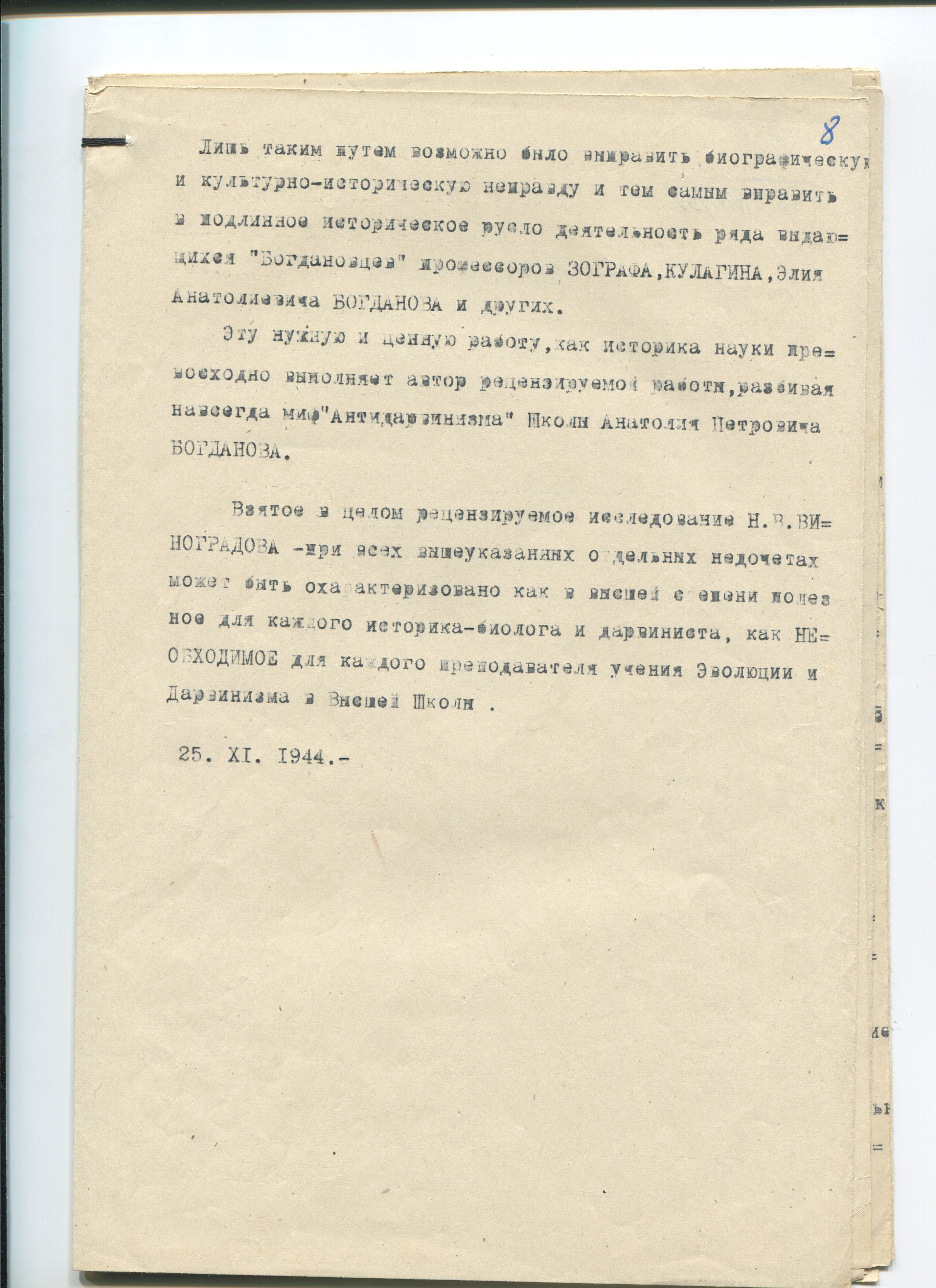 ОФ-10141/97 Рецензия на работу Н.В. Виноградова : "О предшественниках Дарвина и первых дарвинистах России" (представленной в качестве диссертации на учёную степень кандидата биологических наук). Время создания: 1944 нояб.25. Полнота: полная. Подлинность: копия. Способ воспроизведения: машинопись. Примечания: Т. V.