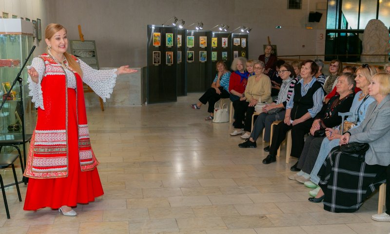 Далее программа продолжилась на вернисаже. Заведующая организационным отделом, куратор мероприятия, Марина Галич представила участникам праздничного события выставку «Творчество добрых дел». Она знакомит с художественными работами Ирины Олейник, Ирины Балабенковой, Ларисы Тихоновой — талантливых участников из студии живописи при центре «Московское долголетие» Гагаринского района ЮЗАО города Москвы. А также показывает удивительные работы народного умельца, резчика по дереву, Алексея Викторовича Хаустова.