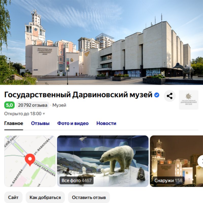 Страница Дарвиновского музея в Яндекс Картах и справочнике теперь отмечена наивысшим рейтингом 5.0  — это пять заслуженных звезд!
