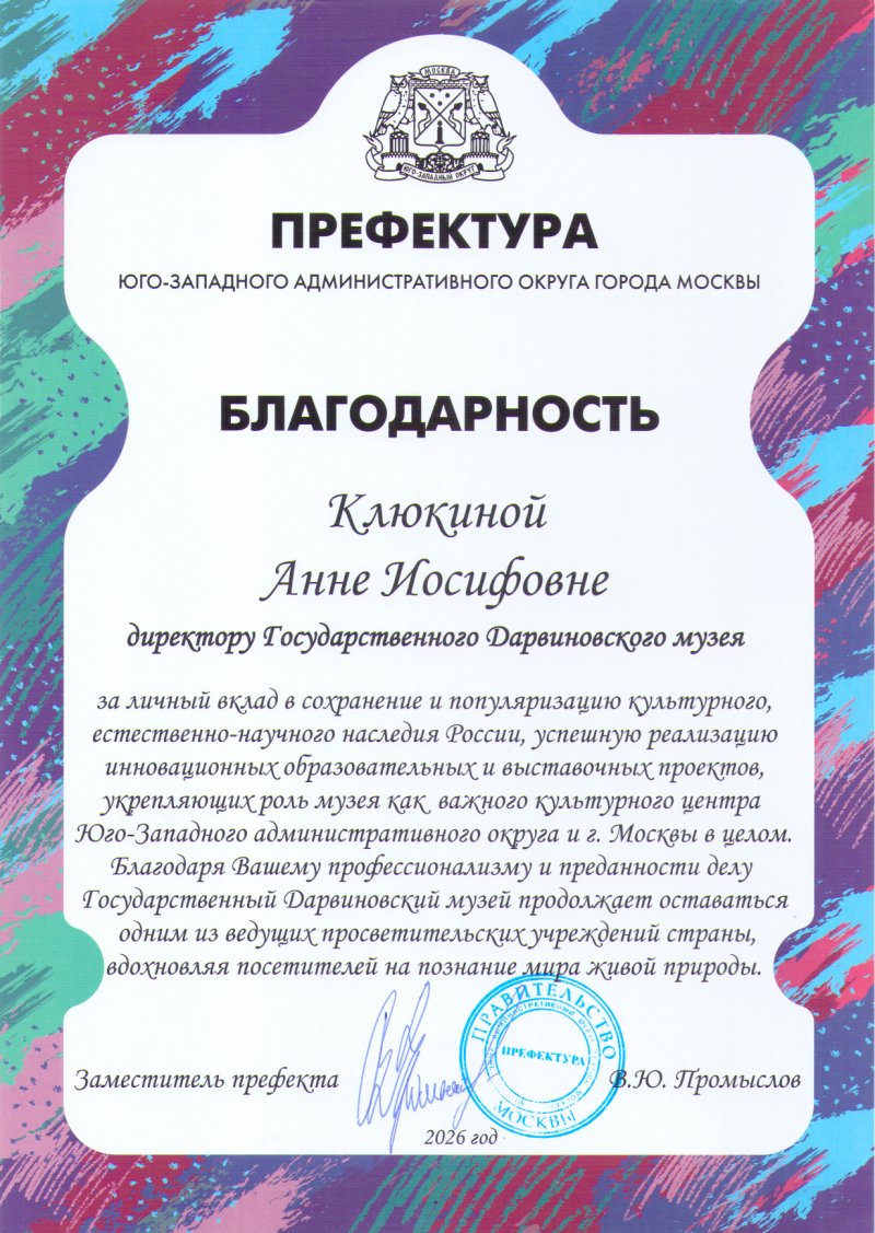 В День работника культуры Префектура Юго-Западного административного округа города Москвы поздравила директора Государственного Дарвиновского музея Анну Иосифовну Клюкину с профессиональным праздником, отметив роль музея  в сохранении  и популяризации культурного наследия нашей страны.