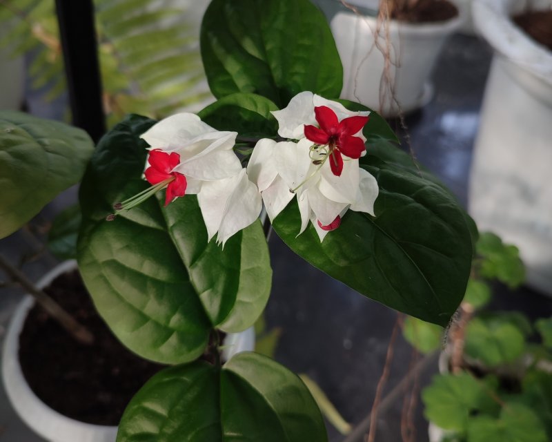 Рядом с ним, на этажерке, у молодого экземпляра лианы Клеродендрум госпожи