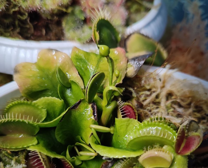 Однако больше всего интригует обитатель аквариума с хищными растениями – венерина мухоловка. Из центра ее розетки медленно поднимаются мясистые светло-зеленые бутоны. Обычно в комнатных условиях ее цветоносы обрезают, чтобы растение формировало более крупные листья. Но нам хочется, чтобы посетители могли полюбоваться нежными цветками в обрамлении хищных ловушек венериной мухоловки. Времени до раскрытия бутонов не очень много – приходите любоваться началом цветения в оранжерее Дарвиновского музея!