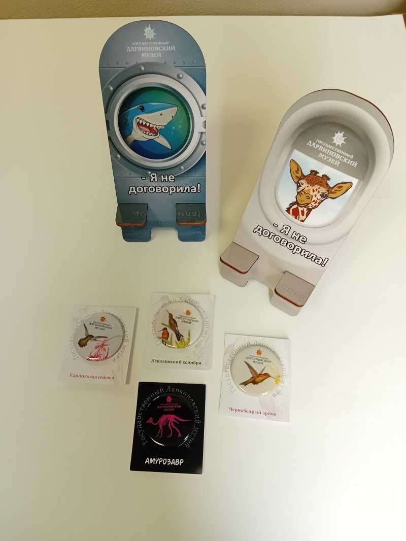 Музей заказал чехлы для карт с акварелями В. А. Горячевой «Кошки» и «Рыжик кот и бабочка», с изображением картины В. А. Ватагина «Снежный барс». Не только котики правят миром, но и мемы. Мем «Я не договорила!» с жирафом и акулой стали рисунком для подставки для телефона. На выставке «Размер имеет значение» крупные животные — это динозавры, а маленькие — колибри. Изящные птички, которые пьют нектар, стали героями значков. Много малышей занимаются в Дошкольной академии Дарвиновского музея. Для таких деток музей заказал блокноты и значки с символикой академии.