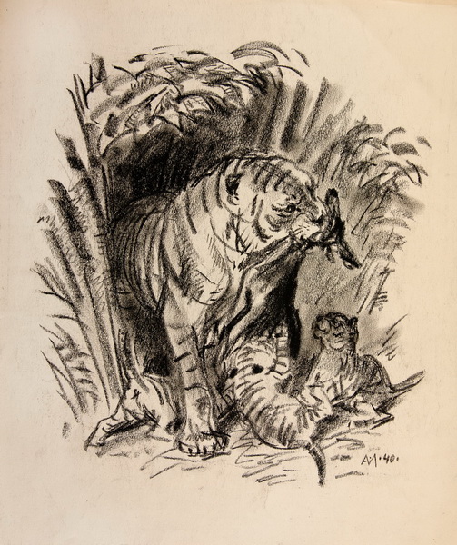 Тигрица с тигрятами. Графика. Бумага, уголь. Лаптев А.М. (1905-1965). 1940 г.