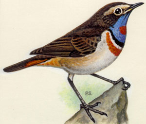 По соседству с камышовой овсянкой часто поет варакушка. Это близкий родич соловья, и песня у нее также очень разнообразна и красива. Отдельные строфы почти всегда повторяются по несколько раз, иногда птица взлетает с песней вверх. Постарайтесь ее рассмотреть в бинокль, ведь варакушка - одна из самых ярких и красивых наших птиц.
