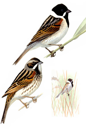 В сырых ивняках вы обязательно услышите камышовую овсянку. Несколько пар этих овсянок ежегодно гнездится на п-ове. Поющих самцов легко заметить - обычно они сидят на вершинах кустов и выводят свою незамысловатую песенку.