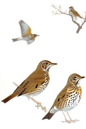 На опушках леса и в кустах легко спугнуть певчего дрозда. Эта птица гнездится в лесу, на п-ове встречаются только пролетные особи. Обычно птица быстро взлетает с земли с характерным тонким криком "ц". Некоторые самцы поют и на пролете, но услышать певчего дрозда на п-ове можно только рано утром, до 8-9 часов утра.
